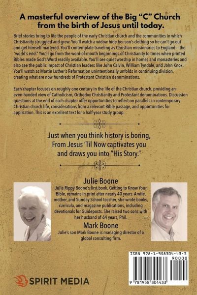A masterful overview of the Big "C" Church from the birth of Jesus until today. Brief stories bring to life the people of the early Christian church and the communities in which Christianity struggled and grew. You'll watch a widow hide her son's clothing so he can't go out and get himself martyred. You'll contemplate traveling as Christian missionaries to England -- the "world's end." You'll go from the word-of-mouth beginnings of Christianity to times when printed Bibles made God's Word readily available. You'll see quiet worship in homes and monasteries and also see the public impact of Christian leaders like John Calvin, William Tyndale, and John Knox. You'll watch as Martin Luther's Reformation unintentionally unfolds in continuing division, creating what are now hundreds of Protestant Christian denominations. Each chapter focuses on roughly one century in the life of the Christian church, providing an even-handed view of Catholicism, Orthodox Christianity and Protestant denominations. Discussion questions at the end of each chapter offer opportunities to reflect on parallels in contemporary Christian church life, considerations from a relevant Bible passage, and opportunities for application. This is an excellent text for a half-year study group. Just when you think history is boring, From Jesus 'Til Now captivates you and draws you into "His Story."