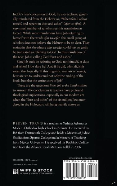 In Job's final concession to God, he uses a phrase generally translated from the Hebrew as, ""Wherefore I abhor myself, and repent in dust and ashes"" (afar va-eifer). A very small number of scholars see this translation as forced. While most translations have Job referring to himself with the words afar va-eifer, this small group of scholars does not believe the Hebrew to be so clear. They maintain that the phrase afar va-eifer could just as easily be translated as referring to God. In this translation of the text, Job is calling God ""dust and ashes."" Can Job truly be referring to God, not himself, as dust and ashes? How dare he? And if he did, what did this mean theologically? If this linguistic analysis is correct, how are we to understand not only the ending of the book, but also the entire story of Job? These are the questions From Job to the Shoah strives to answer. The conclusions it reaches have profound theological implications, especially in our modern era when the ""dust and ashes"" of the six million Jews murdered in the Holocaust still hang heavily above us.