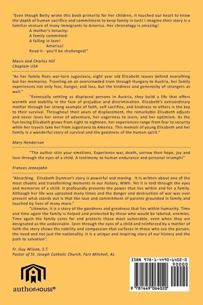 When it was rumored that the communist partisans planned to destroy Sremska Mitrovica, Jugoslavia as the German Military retreated, the father persuaded the mother to leave the city for a short time, taking the five children and her mother to a safe place until the fighting was over. They boarded the over-crowded last train going west, away from the terror that was imminent. They had no idea where they were going nor how long they would have to be away from home. The father could not leave the city; he was drafted into a "home guard" and charged with protecting the city. The family never returned to Sremska Mitrovica. Separated during the war, miraculously all family members, except for one son, were reunited in the American Sector of Austria. The second oldest son had been living and working near Berlin, Germany as a foreign worker. "Liberated" by the Russians he was sent "home" to Jugoslavia, which was by then behind the iron curtain leaving him with no chance of joining his family in the west. They endured fear, discrimination and persecution during the post-war years in a country of which they did not even speak the language. The family lived in deplorable conditions in a makeshift "Displaced Person's camp", commonly known as a "D.P.camp". The family survived hunger, displacement and many other hardships with patience and courage while relying on their faith.