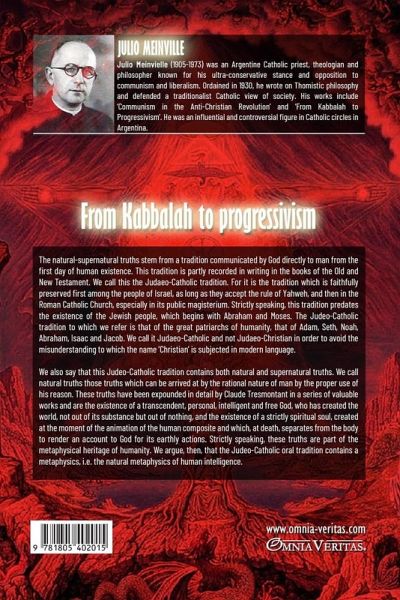 The natural-supernatural truths stem from a tradition communicated by God directly to man from the first day of human existence. This tradition is partly recorded in writing in the books of the Old and New Testament. We call this the Judaeo-Catholic tradition. For it is the tradition that is faithfully preserved first among the people of Israel, as long as they accept the rule of Yahweh, and then in the Roman Catholic Church, especially in its public magisterium. Strictly speaking, this tradition predates the existence of the Jewish people, which begins with Abraham and Moses. The Judeo-Catholic tradition to which we refer is that of the great patriarchs of humanity, that of Adam, Seth, Noah, Abraham, Isaac and Jacob. We call it Judeo-Catholic and not Judeo-Christian in order to avoid the misunderstanding to which the name 'Christian' is subjected in modern language. We also say that this Judeo-Catholic tradition contains both natural and supernatural truths. We call natural truths those truths which can be arrived at by the rational nature of man by the proper use of his reason. These truths have been expounded in detail by Claude Tresmontant in a series of valuable works and are the existence of a transcendent, personal, intelligent and free God, who has created the world, not out of its substance but out of nothing, and the existence of a strictly spiritual soul, created at the moment of the animation of the human composite and which, at death, separates from the body to render an account to God for its earthly actions. Strictly speaking, these truths are part of the metaphysical heritage of humanity. We argue, then, that the Judeo-Catholic oral tradition contains a metaphysics, i.e. the natural metaphysics of human intelligence.