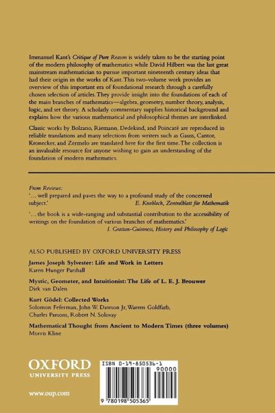 Immanuel Kant's Critique of Pure Reason is widely taken to be the starting point of the modern period of mathematics while David Hilbert was the last great mainstream mathematician to pursue importatn nineteenth century ideas. This two-volume work provides an overview of this important era of mathematical research through a carefully chosen selection of articles. They provide an insight into the foundations of each of the main branches of mathematics - algebra, geometry, number theory, analysis, logic, and set theory - with narratives to show how they are linked. Classic works by Bolzano, Riemann, Hamilton, Dedekind, and Poincare are reproduced in reliable translations and many selections from writers such as Gauss, Cantor, Kronecher, and Zermelo are here translated for the first time. The collection is an invaluable source for anyone wishing to gain an understanding of the foundation of modern mathematics.