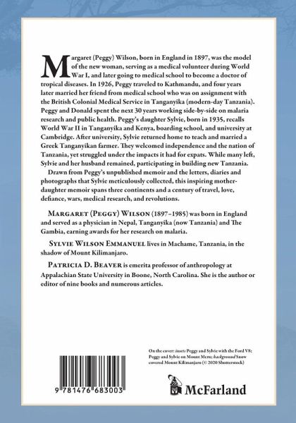 Margaret (Peggy) Wilson, born in England in 1897, was the model of the new woman, serving as a medical volunteer during World War I, and later going to medical school to become a doctor of tropical diseases. In 1926, Peggy traveled to Kathmandu, and four years later married her friend from medical school who was on assignment with the British Colonial Medical Service in Tanganyika (modern-day Tanzania). Peggy and Donald spent the next 30 years working side-by-side on malaria research and public health, winning multiple awards in the process. Peggy's daughter Sylvie, born in 1935, recalls World War II in Tanganyika and Kenya, boarding school, and university at Cambridge. After university, Sylvie returned home to teach and married a Greek Tanganyikan farmer. They welcomed independence and the nation of Tanzania, yet struggled under the impacts it had for expats. While most of the Greek community left Tanzania, Sylvie and her husband persisted on the slopes of Kilimanjaro, participating in building new Tanzania. Drawn from Peggy's unpublished memoir and the letters, diaries and photographs that Sylvie meticulously collected, this inspiring mother-daughter memoir spans three continents and a century of travel, love, defiance, wars, medical research, and revolutions.