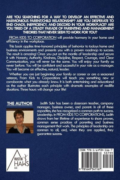 ARE YOU SEARCHING FOR A WAY TO DEVELOP AN EFFECTIVE AND HARMONIOUS PARENT/CHILD RELATIONSHIP? ARE YOU DESPERATE TO END CHAOS, INEFFICIENCY, AND DISCORD IN YOUR WORKPLACE? ARE YOU TIRED OF A STEADY PARADE OF PARENTING AND MANAGEMENT THEORIES THAT NEVER SEEM TO WORK FOR YOU? FROM KIDS TO CORPORATIONS will provide harmony in your home and efficiency in the workplace.This book applies time-honored principles of behavior to today's home and business environments and presents you with a proven road-map to success. The result is amazing! Once you put on the mantle of leadership and secure it with Honesty, Authority, Kindness,Discipline, Respect, Courage, and Clear Communication, you will never be the same. You will enjoy your family as never before. You will be confident and successful in your role as a manager. You will become an effective, natural, leader.Whether you are just beginning your family or career or are a seasoned veteran, From Kids to Corporations will teach you something new or corroborate what you already know. It is both entertaining and educational as the author illustrates each principle with dramatic examples of real life situations. Three hours will change your life!