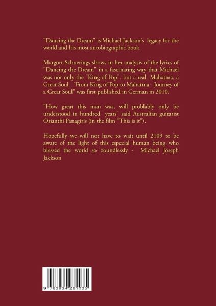 "Dancing the Dream" is Michael Jackson's legacy for the world and his most autobiographic book. Margott Schuerings shows in her analysis of the lyrics of "Dancing the Dream" in a fascinating way that Michael was not only the "King of Pop", but a real Mahatma, a Great Soul. "From King of Pop to Mahatma - Journey of a Great Soul" was first published in German in 2010. "How great this man was, will problably only be understood in hundred years" said Australian guitarist Orianthi Panagiris (in the film "This is it"). Hopefully we will not have to wait until 2109 to be aware of the light of this especial human being who blessed the world so boundlessly - Michael Joseph Jackson