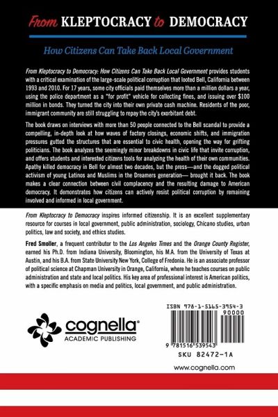 From Kleptocracy to Democracy: How Citizens Can Take Back Local Government provides students with a critical examination of the large-scale political corruption that looted Bell, California between 1993 and 2010. For 17 years, some city officials paid themselves more than a million dollars a year, using the police department as a "for profit" vehicle for collecting fines, and issuing over $100 million in bonds. They turned the city into their own private cash machine. Residents of the poor, immigrant community are still struggling to repay the city’s exorbitant debt. The book draws on interviews with more than 50 people connected to the Bell scandal to provide a compelling, in-depth look at how waves of factory closings, economic shifts, and immigration pressures gutted the structures that are essential to civic health, opening the way for grifting politicians. The book analyzes the seemingly minor breakdowns in civic life that invite corruption, and offers students and interested citizens tools for analyzing the health of their own communities. Apathy killed democracy in Bell for almost two decades, but the press—and the dogged political activism of young Latinos and Muslims in the Dreamers generation— brought it back. The book makes a clear connection between civil complacency and the resulting damage to American democracy. It demonstrates how citizens can actively resist political corruption by remaining involved and informed in local government. From Kleptocracy to Democracy inspires informed citizenship. It is an excellent supplementary resource for courses in local government, public administration, sociology, Chicano studies, urban politics, law and society, and ethics studies. Fred Smoller, a frequent contributor to the Los Angeles Times and the Orange County Register, earned his Ph.D. from Indiana University, Bloomington, his M.A. from the University of Texas at Austin, and his B.A. from State University New York, College of Fredonia. He is an associate professor of political science at Chapman University in Orange, California, where he teaches courses on public administration and state and local politics. His key area of professional interest is American politics, with a specific emphasis on media and politics, local government, and public administration.