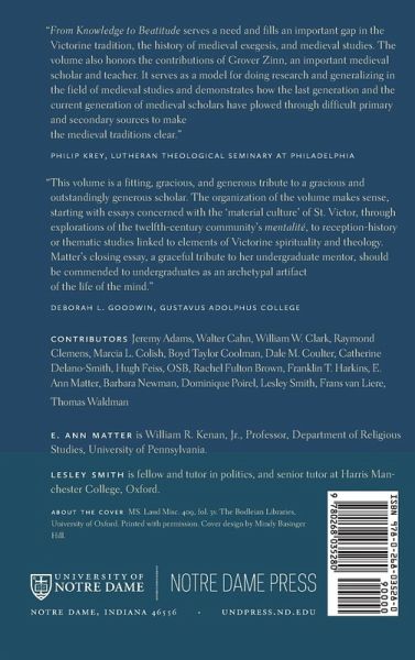 From Knowledge to Beatitude is a collection of original essays on the intersection between Christian theology and spiritual life primarily in the twelfth and thirteenth centuries, especially in the Parisian School of St. Victor, which honors the influential work of Grover A. Zinn, Jr. Written by distinguished scholars from various fields of medieval studies, these essays range from the study of the exegetical school of twelfth-century St. Victor and medieval glossed Bibles to the medieval cultural reception of women visionaries, preachers, and crusaders. Although focused on St. Victor, they provide analyses of Christian themes up to the modern period. A common thread is Zinn's careful attention to the connections between medieval spirituality and biblical studies, the origin of these ideas, and their lasting influence in Christian culture. The essays take us from Hugh of St. Victor's foundation-material culture-to the "beatitude" of a wider understanding of Victorine culture and its lasting legacy. This volume is a fitting tribute to a generous scholar, teacher, and mentor. It will appeal to historians, scholars of religion and theology, and art historians. Contributors: Raymond Clemens, Catherine Delano-Smith, Walter Cahn, William Clark, Thomas Waldman, Franklin T. Harkins, Lesley Smith, Hugh Feiss, Boyd Taylor Coolman, Dale M. Coulter, Marcia L. Colish, Dominique Poirel, Barbara Newman, Rachel Fulton Brown, Jeremy Adams, Frans van Liere, E. Ann Matter