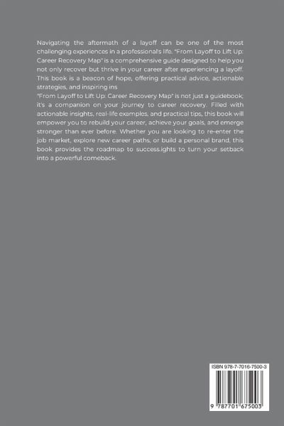 Navigating the aftermath of a layoff can be one of the most challenging experiences in a professional's life. "From Layoff to Lift Up: Career Recovery Map" is a comprehensive guide designed to help you not only recover but thrive in your career after experiencing a layoff. This book is a beacon of hope, offering practical advice, actionable strategies, and inspiring insights to turn your setback into a powerful comeback. Inside this book, you will discover:Emotional Resilience: Learn how to process and manage the emotional impact of a layoff. Understand that it is a natural part of the journey and find ways to stay positive and motivated. Redefining Career Goals: Use this unexpected change as an opportunity to reassess your career aspirations. Identify your strengths, explore new industries, and set meaningful objectives that align with your values. Personal Branding: Craft a compelling personal brand that stands out in a competitive job market. From creating a standout resume to building a strong online presence, this book provides the tools you need to present yourself confidently to potential employers. Job Market Navigation: Gain insights into effective job search strategies, networking techniques, and leveraging online job platforms. Learn how to uncover hidden job markets and accelerate your job search. Gig Economy and Freelancing: Explore the benefits of freelancing and gig opportunities. Discover how to find short-term projects that match your skills, build a successful freelance career, and achieve financial stability. Career Transitioning: Identify transferable skills and explore alternative career paths. Develop a strategic plan for transitioning to a new industry or role, and embrace the possibilities of a fresh career trajectory. Support System Building: Understand the importance of a strong support system. Seek guidance from friends, family, mentors, and career coaches to stay motivated and focused on your recovery journey. Interview Preparation and Job Offer Negotiation: Master the art of interviewing and negotiating job offers. Prepare thoroughly, articulate your value proposition, and confidently navigate the negotiation process. Continuous Learning and Growth: Embrace lifelong learning and professional development. Stay updated with industry trends, seek growth opportunities, and maintain a healthy work-life balance to ensure long-term success. Future Planning: Reflect on the lessons learned, celebrate your achievements, and stay adaptable to new opportunities. Embrace the future with optimism and confidence, knowing that you have the resilience to overcome any challenges. "From Layoff to Lift Up: Career Recovery Map" is not just a guidebook; it's a companion on your journey to career recovery. Filled with actionable insights, real-life examples, and practical tips, this book will empower you to rebuild your career, achieve your goals, and emerge stronger than ever before. Whether you are looking to re-enter the job market, explore new career paths, or build a personal brand, this book provides the roadmap to success.