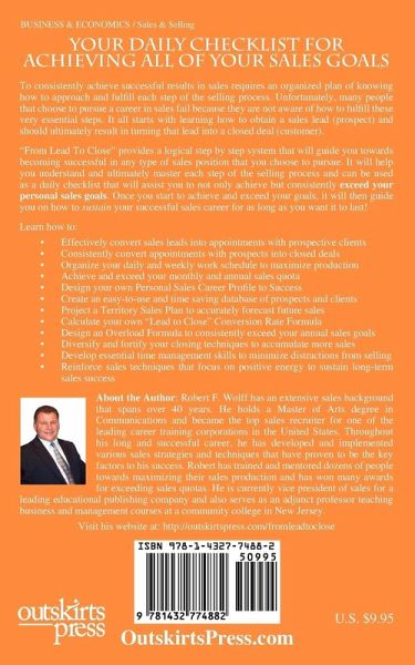 Keep this book with you on a daily basis and you'll be amazed at how helpful and effective it will be, especially for the following: -Emailing and calling Prospective Clients -Meeting for the 1st time with a Prospective Client -Building and maintaining your ability to consistently Close Deals with prospects -Setting up and organizing your Daily and Weekly Work Schedule -Achieving and exceeding your Monthly and Annual Sales Quota -Creating and revising your Annual Territory Sales Plan -Putting yourself in the "Right Mood" to talk and meet with prospects -Achieving and sustaining a Successful Sales Career for life You should also use this book to reinforce these essential sales techniques, strategies and formulas: -Creating an "easy to use" and informative data base of prospects and clients -Projecting a Territory Sales Plan (TSP) to accurately forecast future sales -Calculating a Sales Conversion Rate Formula to determine a realistic sales quota -Designing an "Overload Formula" to consistently exceed your annual sales goals -Fortifying your Closing Techniques to enhance your total sales -Developing essential "time management" skills and techniques -Reinforcing techniques that focus on your positive energy to sustain your long term sales success