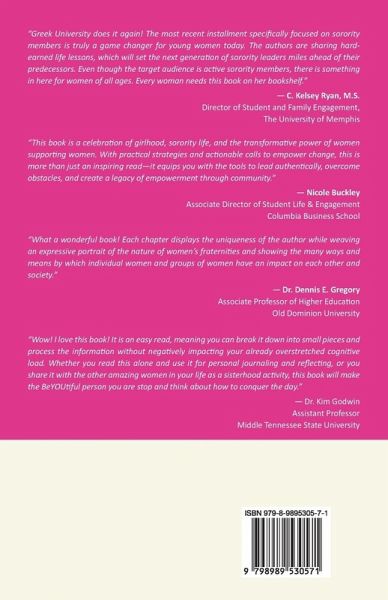From Letters to Leaders: I'm So BeYOUtiful It's Ridiculous! is the ultimate guide for sorority women looking to unleash their inner strength, embrace their self-worth, and foster true sisterhood. This empowering book speaks directly to college women navigating the challenges of academic life, leadership roles, and personal development, all while maintaining the core values of sorority life. With contributions from a team of dynamic and relatable experts, each chapter dives into practical and transformative topics like self-love, mental health, resilience, and authenticity. Learn how to rewrite your inner dialogue with positive affirmations, balance academics with sorority commitments, and redefine friendship in a way that uplifts you and your sisters. From mindfulness practices to leveraging AI for productivity, this book equips you with modern tools and timeless wisdom to succeed in college and beyond. Discover how to rise strong after setbacks, lead with purpose, and own your unique identity unapologetically. Reflect on your journey while planning a future that aligns with your passions and values. Each chapter is a call to action to prioritize your mental well-being, develop meaningful relationships, and create a legacy of leadership that will inspire others. Whether you're a new member, an officer, or a seasoned sorority woman, this book is your guide to thriving as your most beautiful, authentic, and unstoppable self. Prepare to lead, love, and live boldly-because you truly are ridiculous in the best way! Join us on this transformative journey and redefine what it means to be a sorority leader in any council. Let's celebrate you!