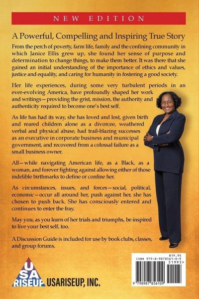 New Edition A Powerful, Compelling, and Inspiring True Story For girls and women who seek to discover their purpose in life, their role in society, and dare not let any obstacle stop them from realizing their quest, their dream-no matter the place of their birth, socioeconomic status, or station in life-which, after all, is America's promise. From the perch of poverty, farm life, family, and the confining community in which Janice Ellis grew up, she found her sense of purpose and determination to change things, to make them better. It was there that she gained an initial understanding of the importance of ethics and values, justice and equality, and caring for humanity in fostering a good society. Her life experiences, during some very turbulent periods in an ever-evolving America, have profoundly shaped her work and writings-providing the grist, mission, authority, and authenticity required to become one's best self. As life has had its way, she has loved and lost, given birth and reared children alone as a divorcee, weathered verbal and physical abuse, had trail-blazing successes as an executive in corporate business and municipal government, and recovered from a colossal failure as a small business owner. All-while navigating American life, as a Black, as a woman, and forever fighting against allowing either of those indelible birthmarks to define or confine her. As circumstances, issues, and forces-social, political, economic-occur all around her, and push against her, she has chosen to push back. She has consciously entered and continues to enter the fray. May you, as you learn of her trials and triumphs, be inspired to live your best self, too. A Discussion Guide is included for use by book clubs, classes, and group forums.