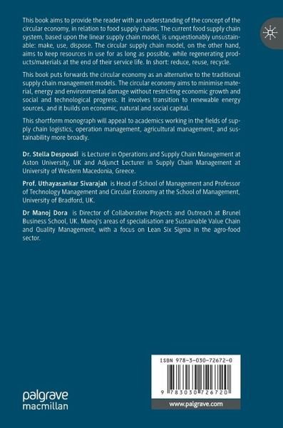 This book aims to provide the reader with an understanding of the concept of the circular economy, in relation to food supply chains. The current food supply chain system, based upon the linear supply chain model, is unquestionably unsustainable: make, use, dispose. The circular supply chain model, on the other hand, aims to keep resources in use for as long as possible, while regenerating products/materials at the end of their service life. In short: reduce, reuse, recycle.