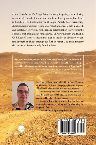 From Lo-Debar to the King's Table is a truly inspiring and uplifting account of Daniel's life and journey from having an orphan heart to Sonship. The book takes you through Daniel's heart-wrenching childhood experiences of feeling unloved, abandoned, lonely, alienated, and isolated. However, his resilience and determination to overcome the obstacles that life has dealt him show his unwavering faith and trust in God. Daniel's story teaches us that even in the face of adversity, we can find strength and hope through our faith in Father God and ultimately that our true identity is only found in Him. Do you know who you are? Where does your identity lie? This book will show you how to find your identity in Christ by seeking His face, ending up in His embrace, as you become an eternal son or daughter of King Jesus! --Lisa Clayton, founder of Get Them to Jesus Ministries and author of A Map from the Womb to Eternity Do you know who you are? Where does your identity lie? This book will show you how to find your identity in Christ by seeking His face, ending up in His embrace, as you become an eternal son or daughter of King Jesus! --Lisa Clayton, founder of Get Them to Jesus Ministries and author of A Map from the Womb to Eternity