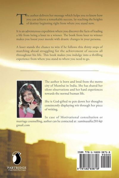 The author delivers her message which helps you to know how you can achieve a remarkable success, by reaching the heights of destiny beginning right from where you stand now. It is an adventurous expedition where you discover the facts of leading a life from being a loser to a winner. The book from loser to winner makes you boost your morale with drastic changes in your persona. A loser stands the chance to win if he follows this thirty steps of marching ahead struggling for the achievement of success all throughout his life. This book makes you indulge into a thrilling experience from where you stand to where you need to go.