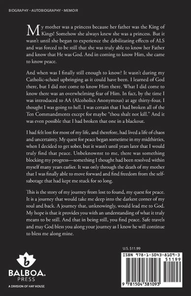 My mother was a princess because her father was the King of Kings! Somehow she always knew she was a princess. But it wasn’t until she began to experience the debilitating effects of ALS and was forced to be still that she was truly able to know her Father and know that he was God. And in coming to know him, she came to know peace. And when was I finally still enough to know? It wasn’t during my Catholic-school upbringing as it could have been. I learned of God there, but I did not come know him there. What I did come to know there was an overwhelming fear of him. In fact, by the time I was introduced to AA (Alcoholics Anonymous) at age thirty-four, I thought I was going to hell. I was certain that I had broken all of the Ten Commandments except for maybe "thou shalt not kill." And it was even possible that I had broken that one in a blackout. I had felt lost for most of my life, and therefore, had lived a life of chaos and uncertainty. My quest for peace began sometime in my midthirties, when I decided to get sober, but it wasn’t until years later that I would truly find that peace. Unbeknownst to me, there was something blocking my progress—something I thought had been resolved within myself many years earlier. It was only through the death of my mother that I was finally able to move forward and find freedom from the self-sabotage that had kept me stuck for so long. This is the story of my journey from lost to found, my quest for peace. It is a journey that would take me deep into the darkest corner of my soul and back. A journey that, unknowingly, would lead me to God. My hope is that it provides you with an understanding of what it truly means to be still. And that in being still, you find peace. Safe travels and may God bless you along your journey as I know he will continue to bless me along mine.