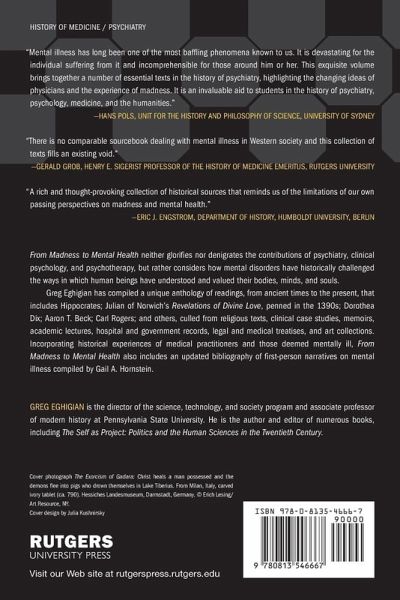 In From Madness to Mental Health, Eghigian has compiled a unique anthology of readings, from ancient times to the present, which also includes an updated bibliography of first-person narratives on mental illness compiled by Gail A. Hornstein. This work considers how mental disorders have historically challenged the ways in which human beings have understood and valued their bodies, minds, and souls.