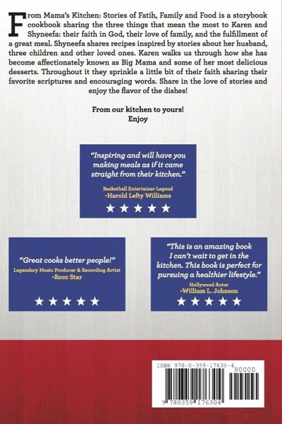 From Mama's Kitchen: Stories of Faith, Family and Food is a storybook cookbook sharing the three things that mean the most to Karen and Shyneefa: their faith in God, their love of family, and the fulfillment of a great meal. Shyneefa shares recipes inspired by stories about her husband, three children and other loved ones. Karen walks us through how she has become affectionately known as Big Mama and some of her most delicious desserts. Throughout it they sprinkle a little bit of their faith sharing their favorite scriptures and encouraging words. Share in the love of stories and enjoy the flavor of the dishes! From our kitchen to yours! Enjoy