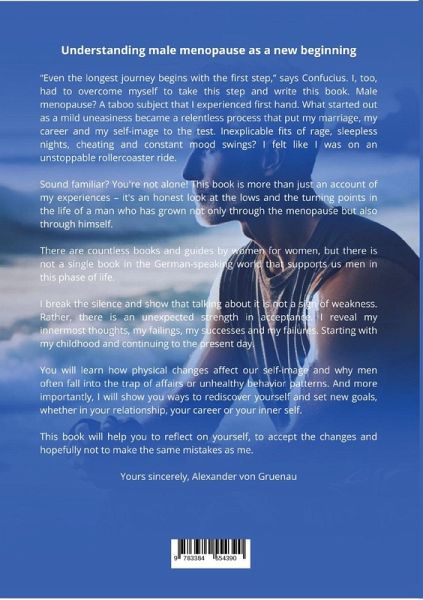 Understanding male menopause as a new beginning"Even the longest journey begins with the first step," says Confucius. I, too, had to overcome myself to take this step and write this book. Male menopause? A taboo subject that I experienced first hand. What started out as a mild uneasiness became a relentless process that put my marriage, my career and my self-image to the test. Inexplicable fits of rage, sleepless nights, cheating and constant mood swings? I felt like I was on an unstoppable rollercoaster ride.Sound familiar? You're not alone! This book is more than just an account of my experiences - it's an honest look at the lows and the turning points in the life of a man who has grown not only through the menopause but also through himself.There are countless books and guides by women for women, but there is not a single book in the German-speaking world that supports us men in this phase of life.I break the silence and show that talking about it is not a sign of weakness. Rather, there is an unexpected strength in acceptance. I reveal my innermost thoughts, my failings, my successes and my failures. Starting with my childhood and continuing to the present day.You will learn how physical changes affect our self-image and why men often fall into the trap of affairs or unhealthy behavior patterns. And more importantly, I will show you ways to rediscover yourself and set new goals, whether in your relationship, your career or your inner self.This book will help you to reflect on yourself, to accept the changes and hopefully not to make the same mistakes as me.Yours sincerely, Alexander von Gruenau
