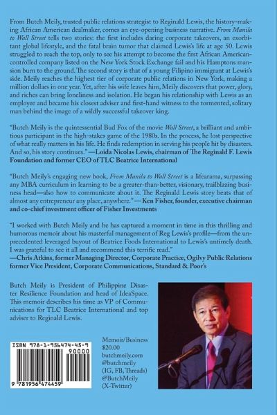From Butch Meily, trusted public relations strategist to Reginald Lewis, the history-making African American dealmaker, comes an eye-opening business narrative. From Manila to Wall Street tells two stories: the first includes daring corporate takeovers, an exorbitant global lifestyle, and the fatal brain tumor that claimed Lewis's life at age 50. Lewis struggled to reach the top, only to see his attempt to become the first African American-controlled company listed on the New York Stock Exchange fail and his Hamptons mansion burn to the ground. The second story is that of a young Filipino immigrant at Lewis's side. Meily reaches the highest tier of corporate public relations in New York, making a million dollars in one year. Yet, after his wife leaves him, Meily discovers that power, glory, and riches can bring loneliness and isolation. He began his relationship with Lewis as an employee and became his closest adviser and first-hand witness to the tormented, solitary man behind the image of a wildly successful takeover king.