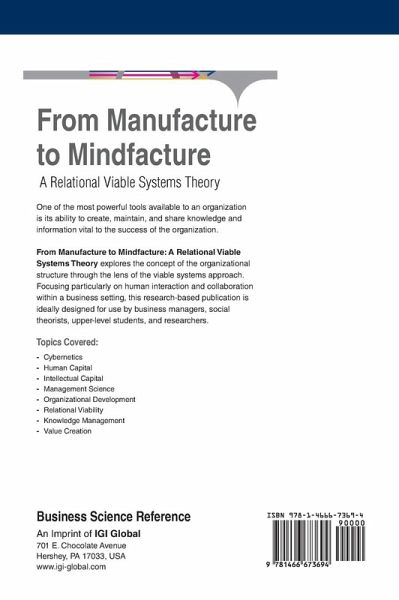 One of the most powerful tools available to an organization is its ability to create, maintain, and share knowledge and information vital to the success of the organization. From Manufacture to Mindfacture: A Relational Viable Systems Theory explores the concept of the organizational structure through the lens of the viable systems approach. Focusing particularly on human interaction and collaboration within a business setting, this research-based publication is ideally designed for use by business managers, social theorists, upper-level students, and researchers.