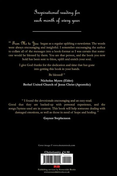 "From Me to You began as a regular uplifting e-newsletter. The words were always encouraging and insightful. I remember encouraging the author to collate all of the messages into a book-format as I was certain that someone would be blessed by them. You are that person, and the book you now hold has been sent to bless, uplift and enrich your soul. I give God thanks for the dedication and time that has gone into getting this book in your hands. Be blessed!" Nicholas Myers (Elder) - Bethel United Church of Jesus Christ (Apostolic) "I found the devotionals encouraging and an easy-read. Good that they are backed-up with personal experience, and the songs/hymns used are in context. This book will help someone dealing with damaged emotions, as well as those in need of hope and healing." Gaynor Stephenson