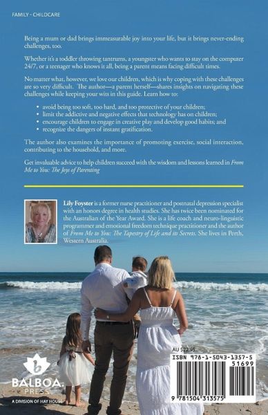 Being a mum or dad brings immeasurable joy into your life, but it brings never-ending challenges, too. Whether its a toddler throwing tantrums, a youngster who wants to stay on the computer 24/7, or a teenager who knows it all, being a parent means facing difficult times. No matter what, however, we love our children, which is why coping with these challenges are so very difficult. The authora parent herselfshares insights on navigating these challenges while keeping your wits in this guide. Learn how to: avoid being too soft, too hard, and too protective of your children; limit the addictive and negative effects that technology has on children; encourage children to engage in creative play and develop good habits; and recognize the dangers of instant gratification. The author also examines the importance of promoting exercise, social interaction, contributing to the household, and more. Get invaluable advice to help children succeed with the wisdom and lessons learned in From Me to You.