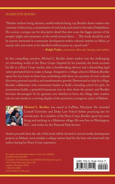 This book recounts Buckler's life in the Peace Corps after a heartbreaking divorce and demanding career prompt him to make a change. Assigned to a village school in Malawi, Buckler opens his home to three boys, embarking with them on a journey of cross-cultural discovery, personal sacrifice, and transformative growth.