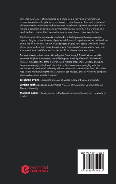 From Microverse to Metaverse: Modelling the Future through Today's Virtual Worlds analyzes the political economy of emerging tech with the mechanisms of identity and behavioral constraints involved to map what a metaverse might be like, whether it can happen, and just why some companies seem so determined to make it happen.
