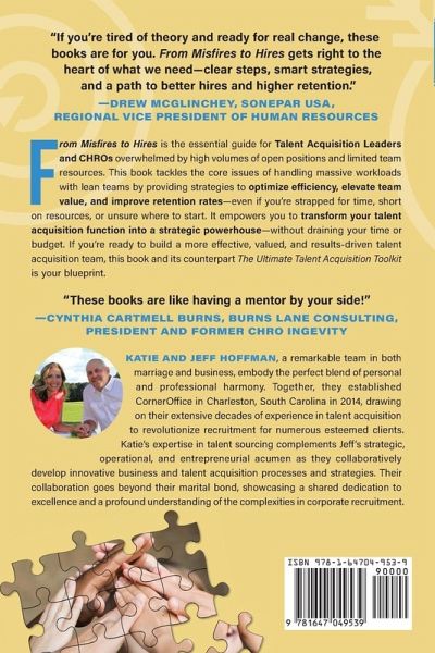 "...gets right to the heart of what we need-clear steps, smart strategies, and a path to better hires and higher retention." -Drew McGlinchey, Regional VP of Human Resources, Sonepar USA "...an inspirational resource for any talent leader looking to level up. The insights...are like having a mentor by your side, guiding you to build a recruiting function that's sharp, strategic, and highly respected." -Cynthia Cartmell Burns, President & CHRO, Burns Lane Consulting ¿¿¿¿¿¿¿"...effortlessly marries strategic insight with practical execution.... If you're looking for tested and proven guidance that your teams can immediately implement to get ahead, this book is what you need!" -Meghan Dougherty, VP of Talent & Organizational Development From Misfires to Hires is the essential guide for Talent Acquisition Leaders and CHROs overwhelmed by high volumes of open positions and limited team resources. This book tackles the core issues of handling massive workloads with lean teams by providing strategies to optimize efficiency, elevate team value, and improve retention rates-even if you're strapped for time, short on resources, or unsure where to start. It empowers you to transform your talent acquisition function into a strategic powerhouse-without draining your time or budget. If you're ready to build a more effective, valued, and results-driven talent acquisition team, this book and its counterpart, The Ultimate Talent Acquisition Toolkit: Interactive Exercises, Guides, and Templates to Supercharge Your Strategy, is your blueprint.