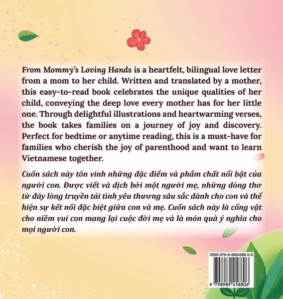 "From Mommy's Loving Hands" is a Vietnamese bilingual children's book by a mother, celebrating her child's uniqueness with heartwarming verses and illustrations, perfect for bedtime and Vietnamese language learning.