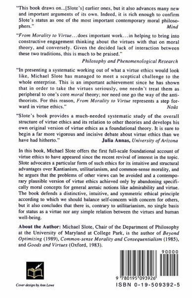 In this book, Michael Slote offers the first full-scale foundational account of virtue ethics to have appeared since the recent revival of interest in the topic. Slote advocates a particular form of such ethics for its intuitive and structural advantages over Kantianism, utilitarianism, and common-sense morality, and he argues that the problems of other views can be avoided and a contemporary plausible version of virtue ethics achieved only by abandoning specifically moral concepts for general aretaic notions like admirability and virtue. The book defends a distinctive, intuitive, and symmetric ethical principle according to which we should balance self-concern with concern for others, but it also concludes that there is, contrary to utilitarianism, no single basis for status as a virtue nor any simple relation between the virtues and human well-being.