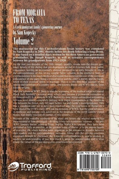 The manuscript for this Czechoslovakian-Texan history was completed by Sam Kopecky in 2001, shortly before his death following a long illness. It was based on a detailed diary written by his (first American generation) grandfather, Dr Joseph Kopecky, as well as extensive correspondence between his grandparents from 1913-1920.