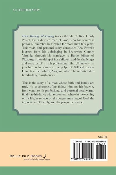 From Morning 'til Evening traces the life of Rev. Grady Powell, Sr., a devoted man of God, who has served as pastor of churches in Virginia for more than fifty years. This vivid and personal story chronicles Rev. Powell's journey from his upbringing in Brunswick County, Virginia, through his marriage to Bertie Jeffress of Pittsburgh, the raising of five children, and the challenges and rewards of a rich professional life. Ultimately, we join him as he stands in the pulpit of Gillfield Baptist Church in Petersburg, Virginia, where he ministered to hundreds of parishioners. This is the story of a man whose faith and family are truly his touchstones. We follow him on his journey from youth to his professional and personal destiny and, finally, to his dance with retirement, where in the evening of his life, he reflects on the deeper meaning of God, the importance of family, and the people he serves.