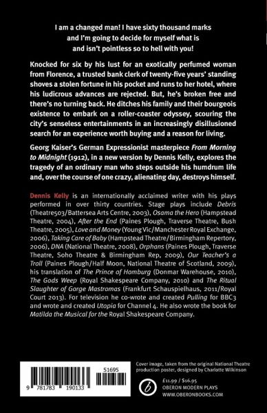 From Morning To Midnight, among the most frequently performed German Expressionist works, charts the life of a cashier who steals money from the bank and flees to Berlin. The unnamed protagonist's bid to escape his middle-class daily life is ultimately frustrated. It is a popular piece in which Kaiser satirized the cheapness and futility of modern society. His hero, a kind of machine-age Everyman, searches everywhere for some kind of fulfilment - in commercial sex, in salvationist religion - but discovers through a series of nightmarish episodes that the world is deceitful and illusory. In the end, disillusioned and pursued by the police, he takes his own life. This new version by Dennis Kelly, opened at the National Theatre's Lyttelton Theatre in November 2013, as part of the National's 50th Anniversary Season. "Offers an exhilarating antidote to the restraints of naturalistic theatre...this is a company show in which Kaiser's savage parable has been brought abundantly to life." Four stars - Guardian "Dennis Kelly's new version of the text remains crisp." Four stars - Evening Standard