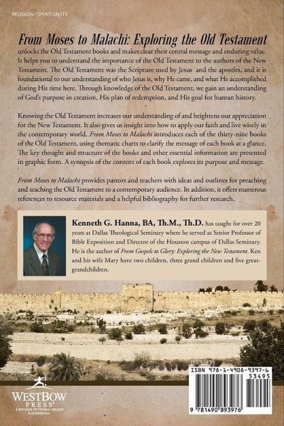 From Moses to Malachi: Exploring the Old Testament unlocks the Old Testament books and makes clear their central message and enduring value. It helps you to understand the importance of the Old Testament to the authors of the New Testament. The Old Testament was the Scripture used by Jesus and the apostles, and it is foundational to our understanding of who Jesus is, why He came, and what He accomplished during His time here. Through knowledge of the Old Testament, we gain an understanding of God's purpose in creation, His plan of redemption, and His goal for human history. Knowing the Old Testament increases our understanding of and heightens our appreciation for the New Testament. It also gives us insight into how to apply our faith and live wisely in the contemporary world. From Moses to Malachi introduces each of the thirty-nine books of the Old Testament, using thematic charts to clarify the message of each book at a glance. The key thought and structure of the books and other essential information are presented in graphic form. A synopsis of the content of each book explores its purpose and message. From Moses to Malachi provides pastors and teachers with ideas and outlines for preaching and teaching the Old Testament to a contemporary audience. In addition, it offers numerous references to resource materials and a helpful bibliography for further research.