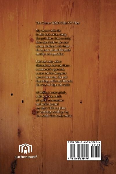 The Corner Table's Point Of View My corner table sits in this back niche, along the path from door to arch, from back hall to the next room, looking to the front door, seen around the jamb another arch provides. I sit and write, allow distractions here and there - a customer's approach, a man and his computer across the room, the pair departing, smiles and frowns, the sway of hips and swish of skirts, a water splash, a bit of voice, a lush of quiet, conversation and radiio beyond my sight. This is a place of watching worlds go by, the worlds that barely notice.