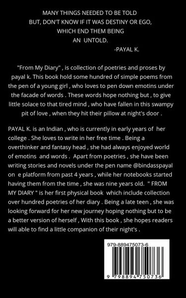 " FROM MY DIARY" is a collection over hundred poetries, which were written by payal k. over past few years . Broadly, she have given herself in to the world of imaginations, penning down her novels, which still need a lot of attention and work but, surely in this journey of betterment, she have tried to add essence of poetic verses into them afterall, she like to write poems since she was 9 . And, what could be better hideout than words . These poems just meant for casual read, to overcome that boring time and have a good leisure .