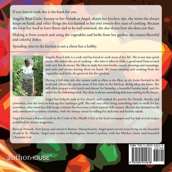 Angelia Ross-Little is a cook and has loved to cook most of her life. She is not into quick meals. She enjoys the art of cooking-the time it takes to make a good meal from scratch with very few shortcuts. She likes to make her own broths, sauces, dressings and seasonings, and rubs and always having them on hand. She loves canning and cooking from the vegetables and herbs she grows in her five gardens. Having a full-time job, she cannot cook as often as she likes, so she looks forward to the weekend, where she spends most of her time in the kitchen, doing what she loves. She will often prepare a nice lunch and dinner for Saturday, a beautiful Sunday meal, and the menu for the following week. But there is always something delicious waiting in the freezer. Angel has helped cook at her church and cooked for parties for friends, family, and coworkers, and she loves to heat up that barbeque grill. She will very often bring something tasty to work for her coworkers, who voted her chili recipe a winner for four years at their annual chili contest. She has also donated meals and contributed to various charities, with the money raised by selling her delicious and healthy salads. Angel has been a featured cook in the Cook of the Month Club at her local newspaper and has had several recipes published in various magazines. Born in Newark, New Jersey, and raised in Boston, Massachusetts, Angel spent several years living on the beautiful island in St. Martin. Angel now resides in Burlington, North Carolina, with her Mother, Aunt, and beautiful Chocolate Lab.