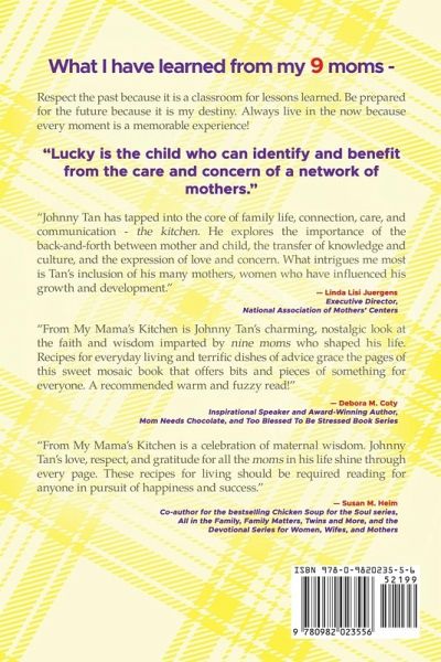 Filled with thought-provoking and life-changing advice from the author's 9 MOMS, this heartwarming exploration of life, family, and love offers self-empowering interpersonal communication skills that lead to personal growth and happiness! From the various kitchen table conversations about life, love, and laughter, Johnny's 9 MOMS approach to parent-child relationships gave him practical life advice, life hacks, and handy tips on the power of relationships, the nature of love, and the meaning of life. Johnny's found family and alternative families have given a new meaning to the concept of family and relationships. From spiritual awareness to self-actualization, the parental advice nourished him with timeless self-help recipes for living, including guidance on assertiveness, motivation, self-esteem, and maintaining a positive mental attitude. These principles of self-empowerment ultimately define him as a person shaped by his thoughts and actions. My 9 MOMS - Conversations about Life, Love, and Laughter, like the original version, From My Mama's Kitchen ~ "food for the soul, recipes for living," is endorsed by the National Association of Mothers' Centers and is for all Moms and Adults of All Ages. It rekindles all the endearing memories we had with our mothers and the power of unconditional motherly love. Advocating personal success begins at home with our family, and within us, it offers a wealth of wisdom, practical living skills, and effective communication techniques. Inspiring and empowering updates are sprinkled throughout this expanded version of the book to complement the 30 timeless recipes for living in Chapter 8. A new Chapter 9 features nine new recipes for living. A tribute to mothers everywhere, serving as a loving reminder that our moms are our family's COO, if not the CEO, it received five awards: Mom's Choice Awards, Mr. Dad Seal of Recognition, Publisher's Choice Awards by Family Magazine Group, International Book Awards, and National Indie Excellence Book Awards. Designed as a keepsake intended to last and inspire for generations, the print version includes a blank dedication page for readers to inscribe their loved one's name and a space where readers can record their favorite recipes for living. As a bonus, Johnny shared nine of his favorite food recipes from his moms at the end of the book! Please join us in spreading this heart-centered and passion-driven book by sharing it as a wonderful gift of love with everyone you know. Since personal success begins at home with our family and within us, let's build a better world together by leaving a legacy of love!