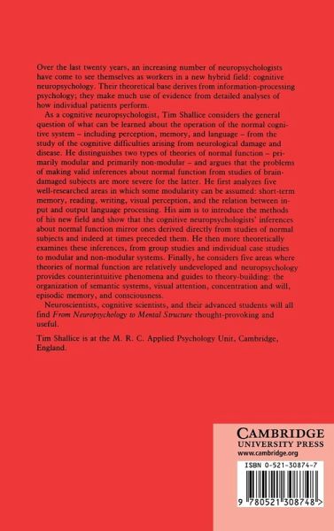 As a cognitive neuropsychologist, Tim Shallice considers the general question of what can be learned about the operation of the normal cognitive system from the study of the cognitive difficulties arising from neurological damage and disease. He distinguishes two types of theories of normal function - primarily modular and primary non-modular - and argues that the problems of making valid inferences about normal function from studies of brain-damaged subjects are more severe for the latter. He first analyzes five well-researched areas in which some modularity can be assumed: short-term memory, reading, writing, visual perception, and the relation between input and output language processing. His aim is to introduce the methods about normal function mirror ones derived directly from studies of normal subjects and indeed at times preceded them. He then more theoretically examines these inferences, from group studies and individual case studies to modular and non-modular systems. Finally, he considers five areas where theories of normal function are relatively undeveloped and neuropsychology provides counterintuitive phenomena and guides to theory-building: the organization of semantic systems, visual attention, concentration and will, episodic memory, and consciousness.