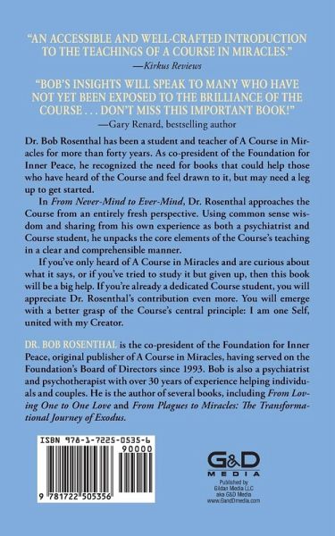 DR. BOB ROSENTHAL is the co-president of the Foundation for Inner Peace, original publisher of A Course in Miracles, having served on the Foundation's Board of Directors since 1992. Bob is also a psychiatrist and psychotherapist with over 30 years of experience helping individuals and couples. He is the author of several books, including From Loving One to One Love and From Plagues to Miracles: The Transformational Journey of Exodus.