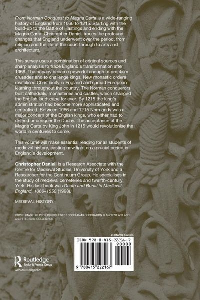 Using a combination of original sources and sharp analysis, this book is sheds new light on a crucial period in England's development. From Norman Conquest to Magna Carta is a wide-ranging history of England from 1066 to 1215 ideal for students and researchers throughout the field of medieval history. Starting with the build-up to the Battle of Hastings and ending with the Magna Carta, Christopher Daniell traces the profound change England underwent over the period, from religion and the life of the court through to arts and architecture. Central discussion topics include: how the Papacy became powerful enough to proclaim Crusades and to challenge kings how new monastic orders revitalized Christianity in England and spread European learning throughout the country how new Norman conquerors built cathedrals, monastries and castles, which changed the English landscape forever how by 1215 the king's administration had become more sophisticated and centralized how the acceptance of the Magna Carta by King John in 1215 would revolutionize the world in centuries to come. This volume will make essential reading for all students and researchers of medieval history.