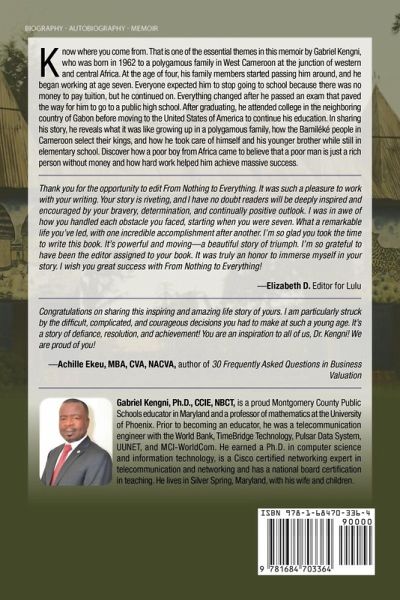 Know where you come from. That is one of the essential themes in this memoir by Gabriel Kengni, who was born in 1962 to a polygamous family in West Cameroon at the junction of western and central Africa. At the age of four, his family members started passing him around, and he began working at age seven. Everyone expected him to stop going to school because there was no money to pay tuition, but he continued on. Everything changed after he passed an exam that paved the way for him to go to a public high school. After graduating, he attended college in the neighboring country of Gabon before moving to the United States of America to continue his education. In sharing his story, he reveals what it was like growing up in a polygamous family, how the Bamiléké people in Cameroon select their kings, and how he took care of himself and his younger brother while still in elementary school.