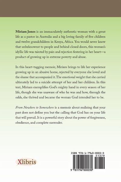 Miriam Jones is an immaculately authentic woman with a great life as a pastor in Australia and a big loving family of five children and twelve grandchildren in Kenya, Africa. You would never know that unbeknownst to people and behind closed doors, this woman's idyllic life was tainted by pain and rejection festering in her heart-a product of growing up in extreme poverty and abuse. In this heart-tugging memoir, Miriam brings to life her experience growing up in an abusive home, rejected by everyone she loved and the shame that accompanied it. The emotional weight that she carried ultimately led to a suicide attempt of her and her children. In this text, Miriam exemplifies God's mighty hand in every season of her life, though she was unaware of who he was and how, through the odds, she thrived and became the woman God intended her to be. From Nowhere to Somewhere is a memoir about realising that your past does not define you but the calling that God has on your life that will prevail. It is a powerful story about the power of forgiveness, obedience, and complete surrender.