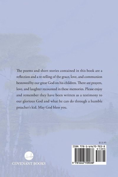 The poems and short stories contained in this book are a reflection and a re-telling of the grace, love, and communion bestowed by our great God on his children. There are prayers, love, and laughter recounted in these memories. Please enjoy and remember they have been written as a testimony to our glorious God and what he can do through a humble preacher's kid. May God bless you.