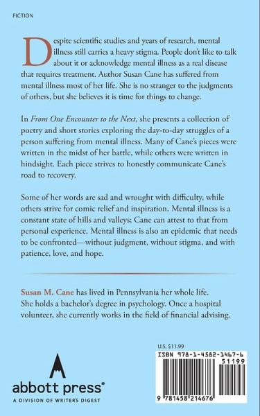 Despite scientific studies and years of research, mental illness still carries a heavy stigma. People don't like to talk about it or acknowledge mental illness as a real disease that requires treatment. Author Susan Cane has suffered from mental illness most of her life. She is no stranger to the judgments of others, but she believes it is time for things to change. In From One Encounter to the Next, she presents a collection of poetry and short stories exploring the day-to-day struggles of a person suffering from mental illness. Many of Cane's pieces were written in the midst of her battle, while others were written in hindsight. Each piece strives to honestly communicate Cane's road to recovery. Some of her words are sad and wrought with difficulty, while others strive for comic relief and inspiration. Mental illness is a constant state of hills and valleys; Cane can attest to that from personal experience. Mental illness is also an epidemic that needs to be confronted-without judgment, without stigma, and with patience, love, and hope.