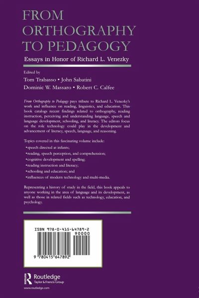 From Orthography to Pedagogy pays tribute to Richard L. Venezky's work and influence on reading, linguistics, and computer science. This book catalogs findings related to speech and language development, reading and spelling's role in infant speech development, and the present and future advances in the study and theory of speech and cognitive development. The editors focus on the role technology could play in development and advancement of literacy speech and reasoning. Topics include: *speech directed at infants; *speech perception; *cognitive development and spelling; *early reading instruction; *reading and comprehension; and *influences of modern technology and multi-media. Representing a history of study in the field, this book appeals to anyone working in the area of language development, as well as those in related fields such as linguistics and developmental psychology.