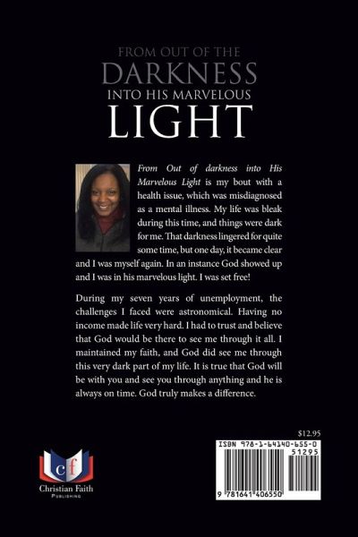 From Out of darkness into His Marvelous Light is my bout with a health issue, which was misdiagnosed as a mental illness. My life was bleak during this time, and things were dark for me. That darkness lingered for quite some time, but one day, it became clear and I was myself again. In an instance God showed up and I was in his marvelous light. I was set free! During my seven years of unemployment, the challenges I faced were astronomical. Having no income made life very hard. I had to trust and believe that God would be there to see me through it all. I maintained my faith, and God did see me through this very dark part of my life. It is true that God will be with you and see you through anything and he is always on time. God truly makes a difference.