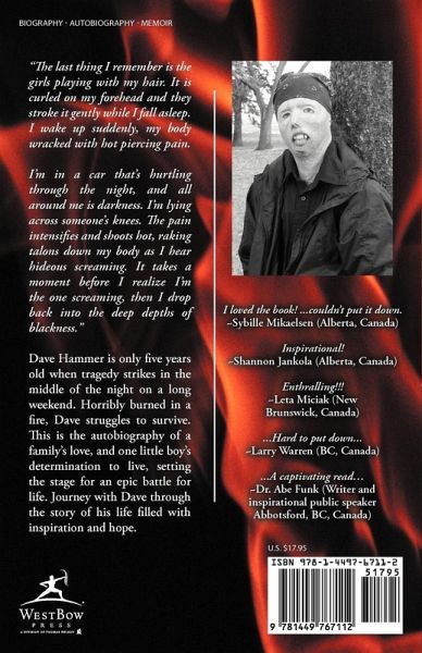 "The last thing I remember is the girls playing with my hair. It is curled on my forehead and they stroke it gently while I fall asleep. I wake up suddenly, my body wracked with hot piercing pain. I'm in a car that's hurtling through the night, and all around me is darkness. I'm lying across someone's knees. The pain intensifies and shoots hot, raking talons down my body as I hear hideous screaming. It takes a moment before I realize I'm the one screaming, then I drop back into the deep depths of blackness." Dave Hammer is only five years old when tragedy strikes in the middle of the night on a long weekend. Horribly burned in a fire, Dave struggles to survive. This is the autobiography of a family's love, and one little boy's determination to live, setting the stage for an epic battle for life. Journey with Dave through the story of his life filled with inspiration and hope.