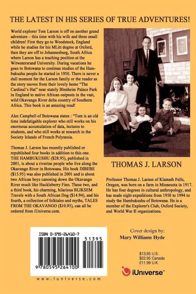 World explorer Tom Larson is off on another grand adventure this time with his wife and three small children! First they go to Woodstock, England while he studies for his MLitt degree at Oxford, then they are off to Johannesburg, South Africa where Larson has a teaching position at the Witwatersrand University. During vacations he goes to Botswana to continue studies of the Hambukushu people he started in 1950.