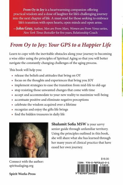 From OY to JOY is your GPS to a happier life! Learn to cope with the inevitable obstacles along your journey to becoming a wise elder using the principles of Spiritual Aging to better navigate the constantly changing challenges of the aging process. This book will help you:release the beliefs and attitudes that bring on OY focus on the thoughts, relationships, and experiences that bring you JOY implement successful strategies for easing the transition from mid-life to old-age stop resisting those unwanted changes that come with time accept and accommodate to your new reality to maximize well-being accentuate positive and eliminate negative perceptions for a more positive mindset celebrate the wisdom acquired over a lifetime recognize and enjoy the gifts life brings find the hidden treasures in daily life "From Oy to Joy is a heartwarming companion offering practical wisdom and a dose of laughter for life's challenging journey into the next chapter of life. A must read for those seeking to embrace life's transition with open hearts, open minds, and open arms." -John Gray, Relationship Coach, New York Times Bestselling Author of Men are From Mars, Women are From Venus series Order your copy today to start turning your OYs to JOYs and make the best of your life for the rest of your life.